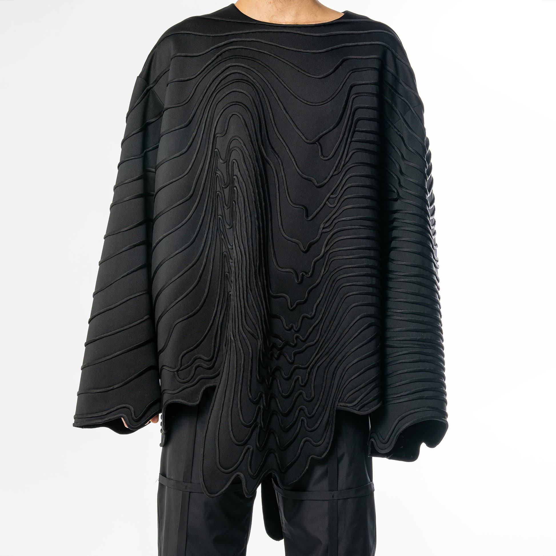 Transmission Psy-couture Hoodie is made with pipings, each of which is completely handcrafted. Designed to represent the vibrations that surround us, and transferred to the third dimension to create a hallucinatory effect.